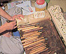 山形仏壇は7工程に分業化されており、最初に木地、宮殿をつくり、その寸法に合わせて彫刻、金具を作ります。仮組みした後、漆塗装を施し、蒔絵、金箔押しをして金具を取り付けて仕組みます。
